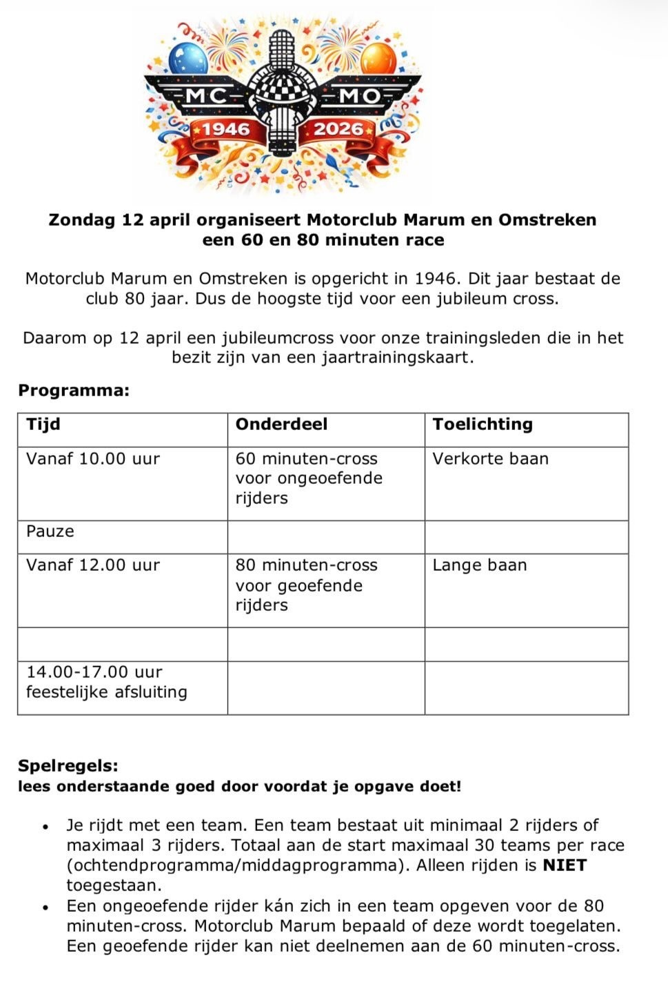 Het wedstrijd programma van Motorclub Marum & Omstreken voor seizoen 2026.