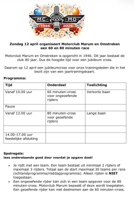 Dit jaar is een bijzonder jaar voor onze club, want we bestaan maar liefst 80 jaar! Sinds de oprichting in 1946 draait alles bij ons om één ding: passie voor motorcross.